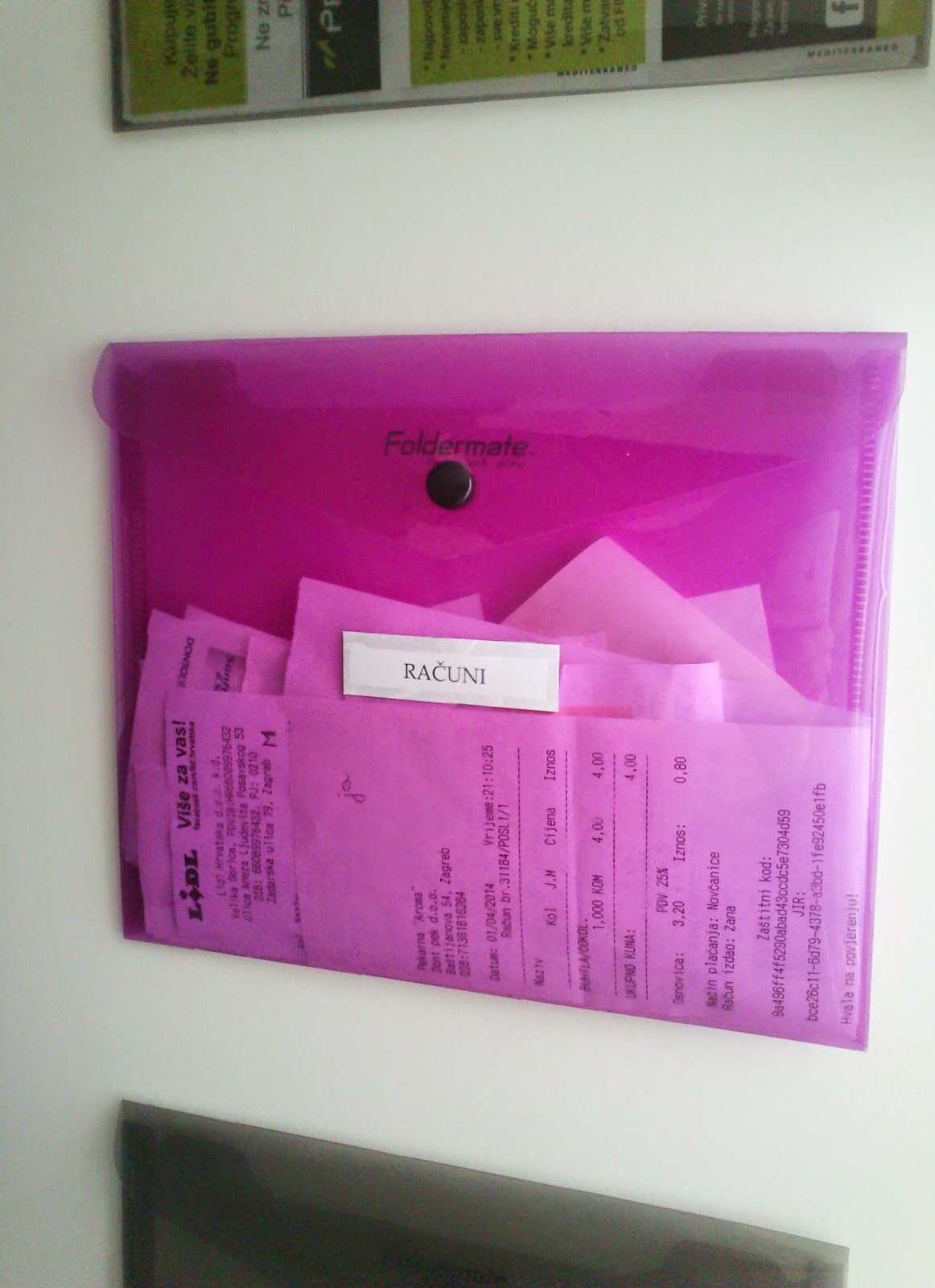 • RAČUNI – iako računi koje dobijem u trgovini tehnički nisu pošta, ipak ih donosim u stan pa prema tome i oni trebaju svoje mjesto (skupljam ih jer na kraju mjeseca volim izračunati troškove, vidjeti na koje sam stvari potrošila najviše novca i odrediti budžet)