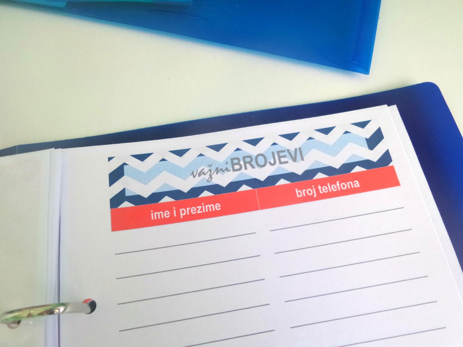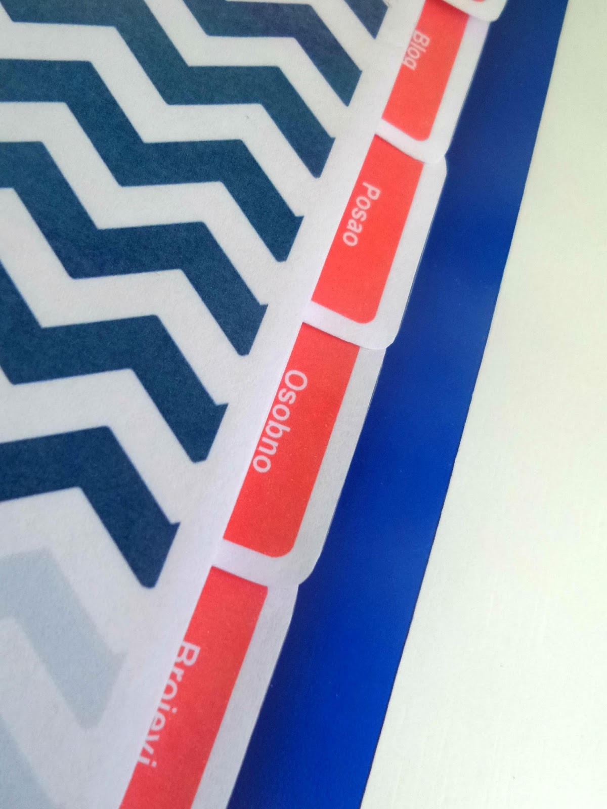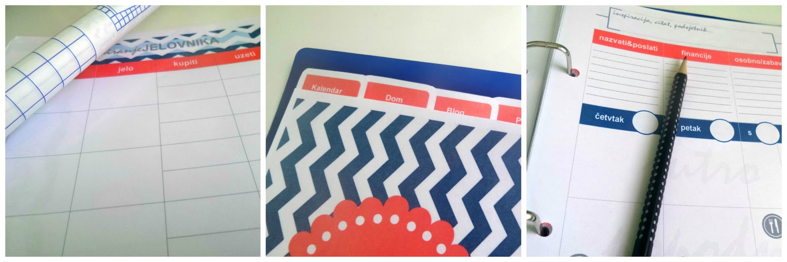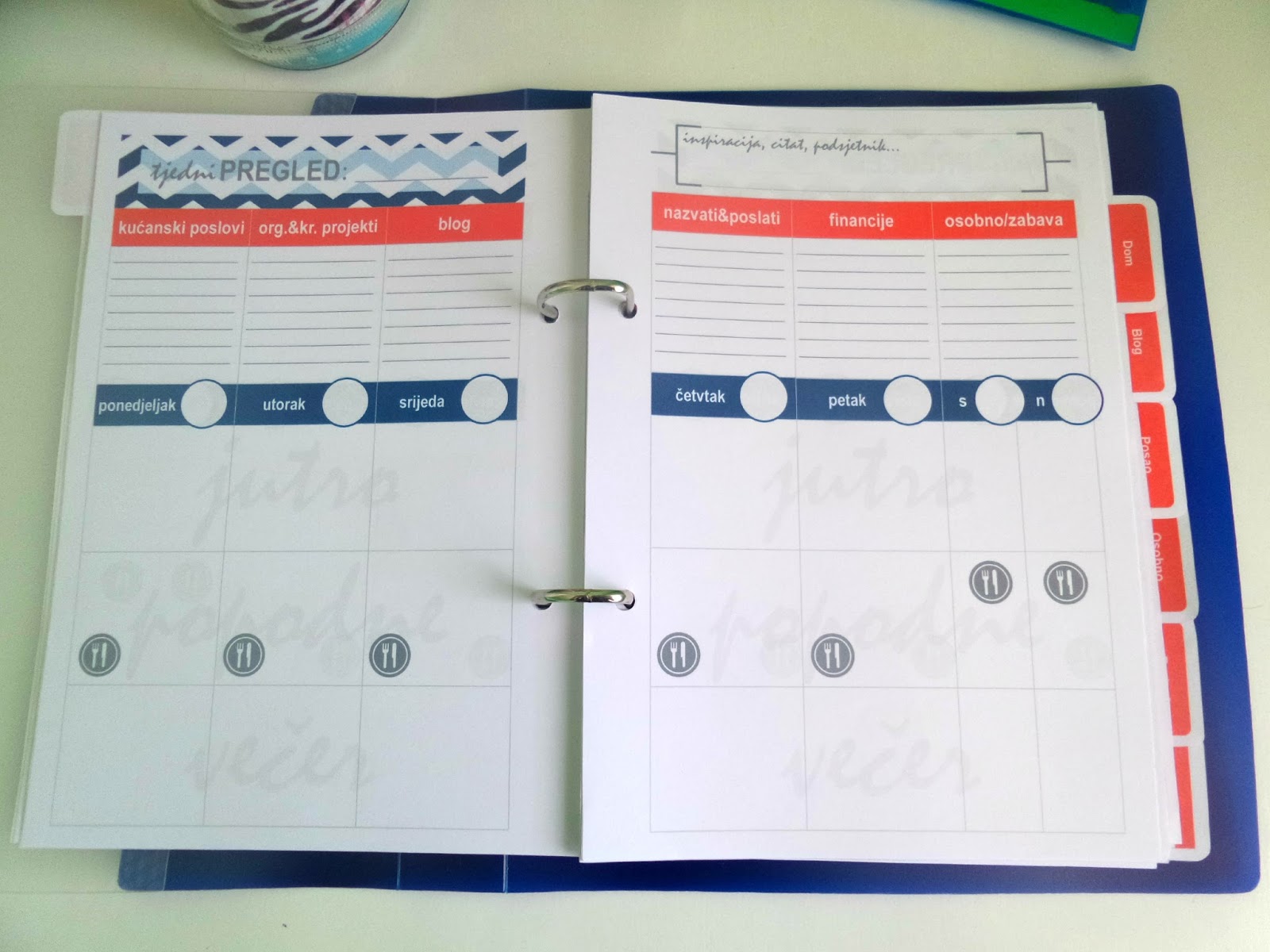 Ovaj sam put, umjesto jedne, plave, odlučila koristiti dvije boje, tamnoplavu i koraljnu. Ubacila sam i malo prugica (ako ste čitali TMI tag, znate da volim prugice). Koristila sam i nove programe – prvu i zadnju stranicu dizajnirala sam pomoću besplatnog programa za obradu fotografija PicMonkey, a razdijelnike i ostale predloške u programuzaobraduteksta (tj. njegovom rođaku, specijaliziranom baš za brošure, letke, pozivnice i sl.). Smanjila sam broj kategorija – neke sam sastavnice izbacila jer ih nisam koristila u starom planeru, neke sam dodala, a neke pregrupirala (planer tako sada ima sedam kategorija – Kalendar, Dom, Blog, Posao, Osobno, Važni brojevi i Bilješke). Promijenila sam i predložak za tjedno planiranje (nadam se da će ovaj biti još bolji i praktičniji). Najdraža novost (uz prugice, naravno) su mi plastificirane stranice (prva, zadnja, razdijelnici i predložak za planiranje jelovnika). Naime, primijetila sam da se početna stranica u starom planeru pokidala zbog stalnog okretanja pa sam stranice odlučila oblijepiti samoljepljivom prozirnom folijom.