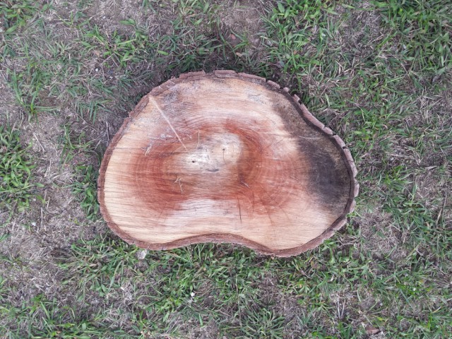Od orahovog (ili nekog drugog) debla motornom pilom odsijecite komad debljine nekoliko centimetara (što tanje možete). Ovo je naravno napravio moj dragi suprug jer bih se ja vjerojatno osakatila. ;D