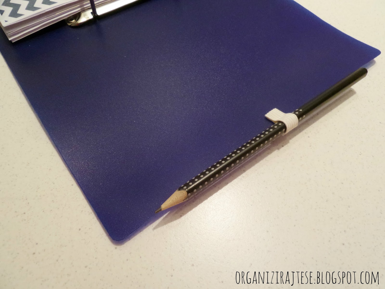 Za izradu ove korisne stvarčice trebat će vam elastična trakica, pištolj s vrućim ljepilom i škare. Trakicu sam omotala oko olovke i zalijepila vrućim ljepilom. Zatim sam odrezala višak i trakicu s rupicom zalijepila na zadnju stranicu planera. Vrlo jednostavno, zar ne?