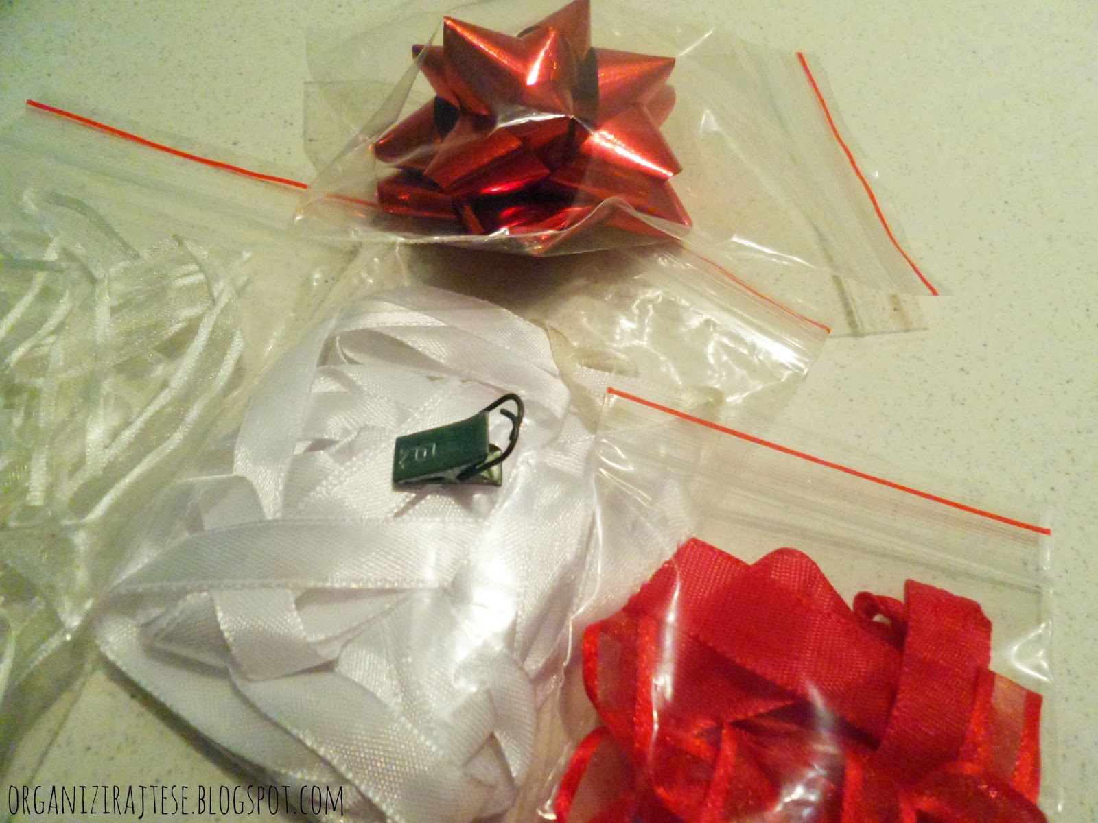 Mašne i trake stavila sam u zip-lok vrećice i spojila ih kopčom za zavjese (možete iskoristiti i spajalicu za papir).