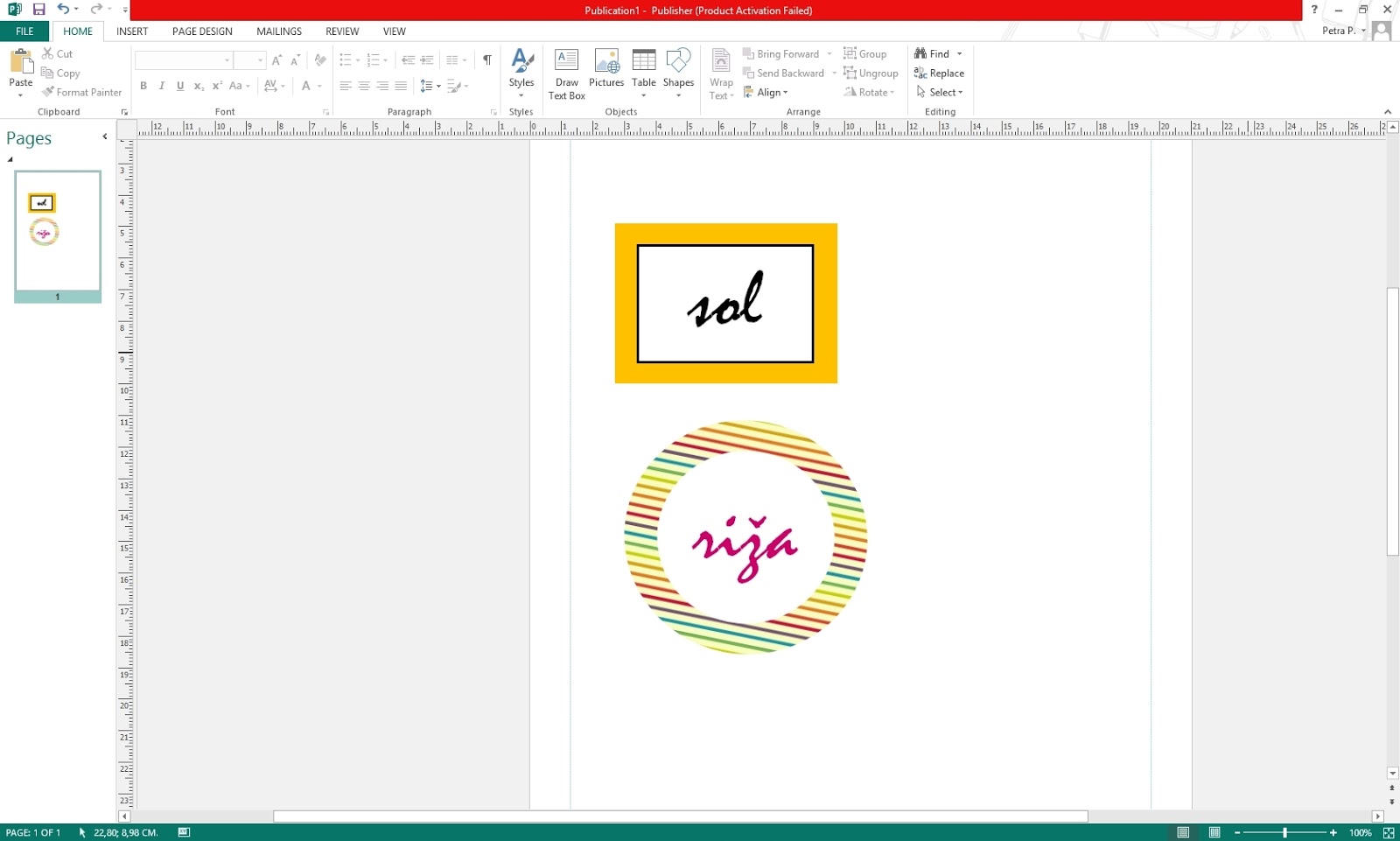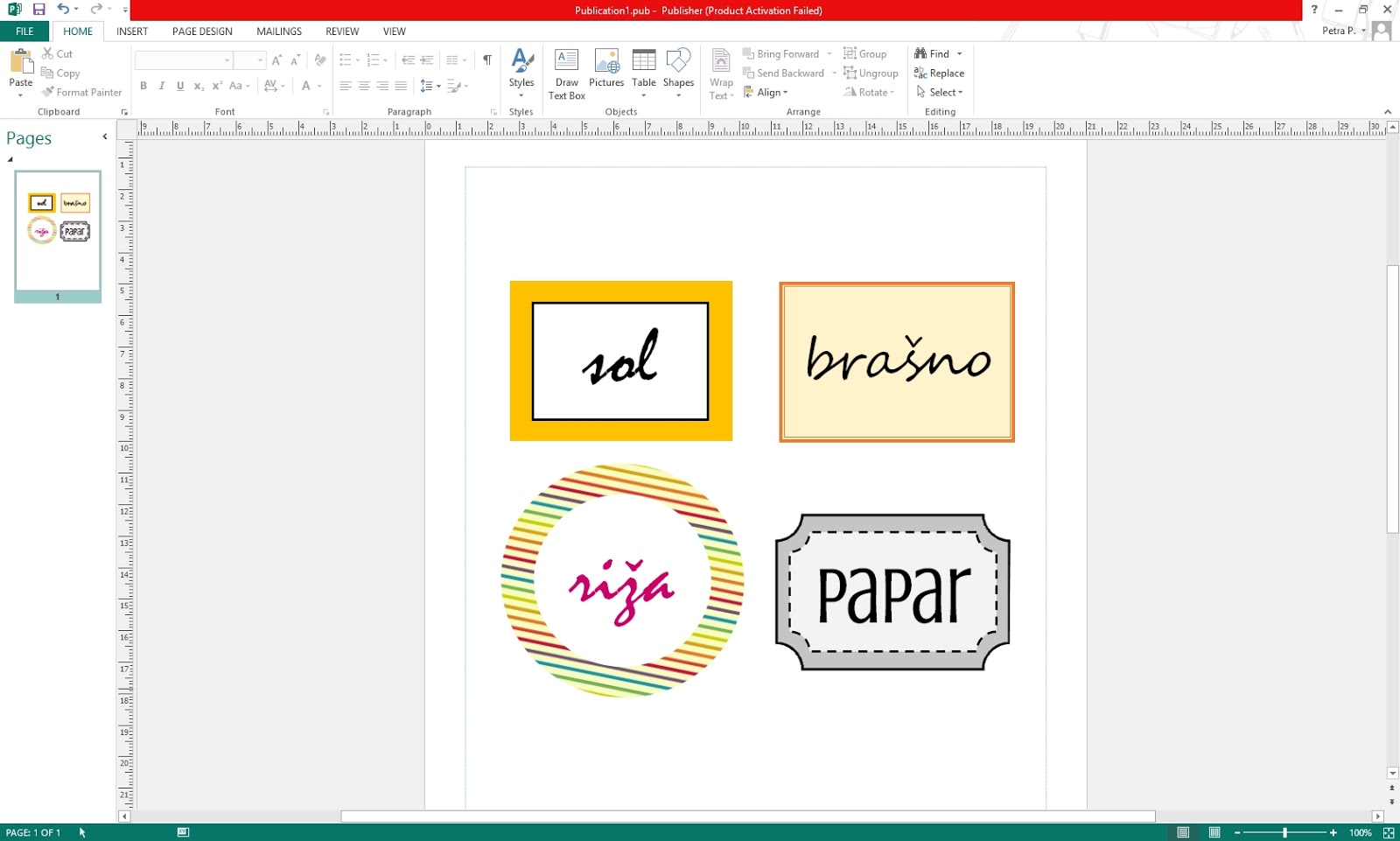 Naljepnica je skoro pa gotova. Jedino još spojite, tj. grupirajte oblik i okvir kako bi naljepnicu mogli bez problema micati po stranici. Kliknite na oblik, pritisnite i držite CTRL, kliknite na okvir i pritisnite Group (Grupiranje).